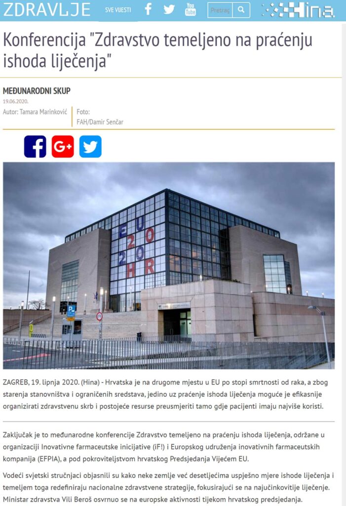 Zaključak je to međunarodne konferencije Zdravstvo temeljeno na praćenju ishoda liječenja, održane u organizaciji Inovativne farmaceutske inicijative (iF!) i Europskog udruženja inovativnih farmaceutskih kompanija (EFPIA), a pod pokroviteljstvom hrvatskog Predsjedanja Vijećem EU.